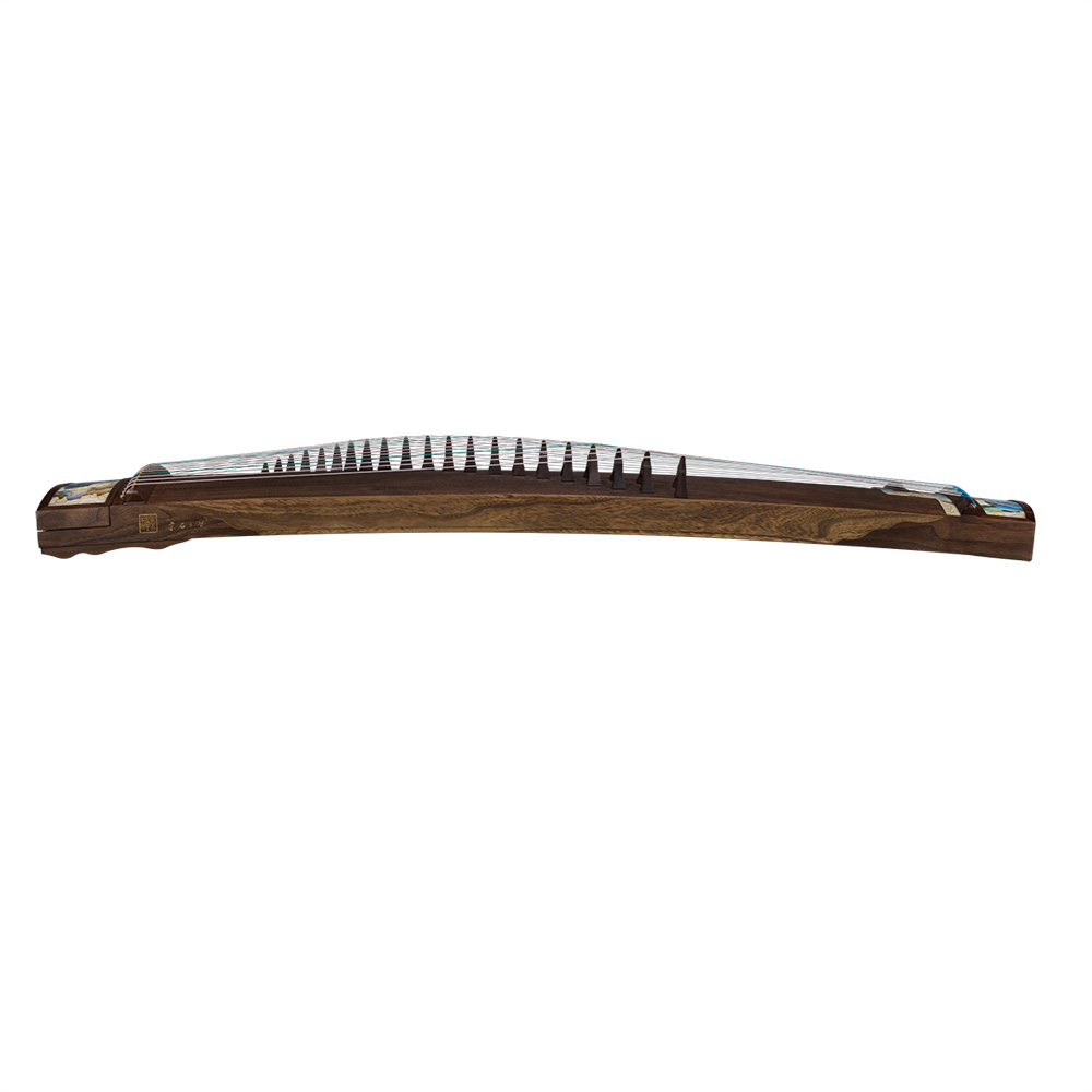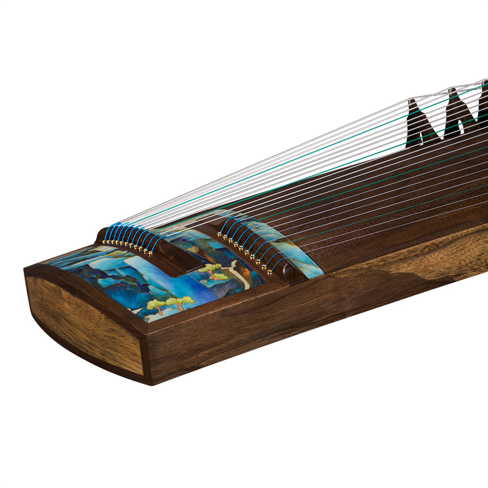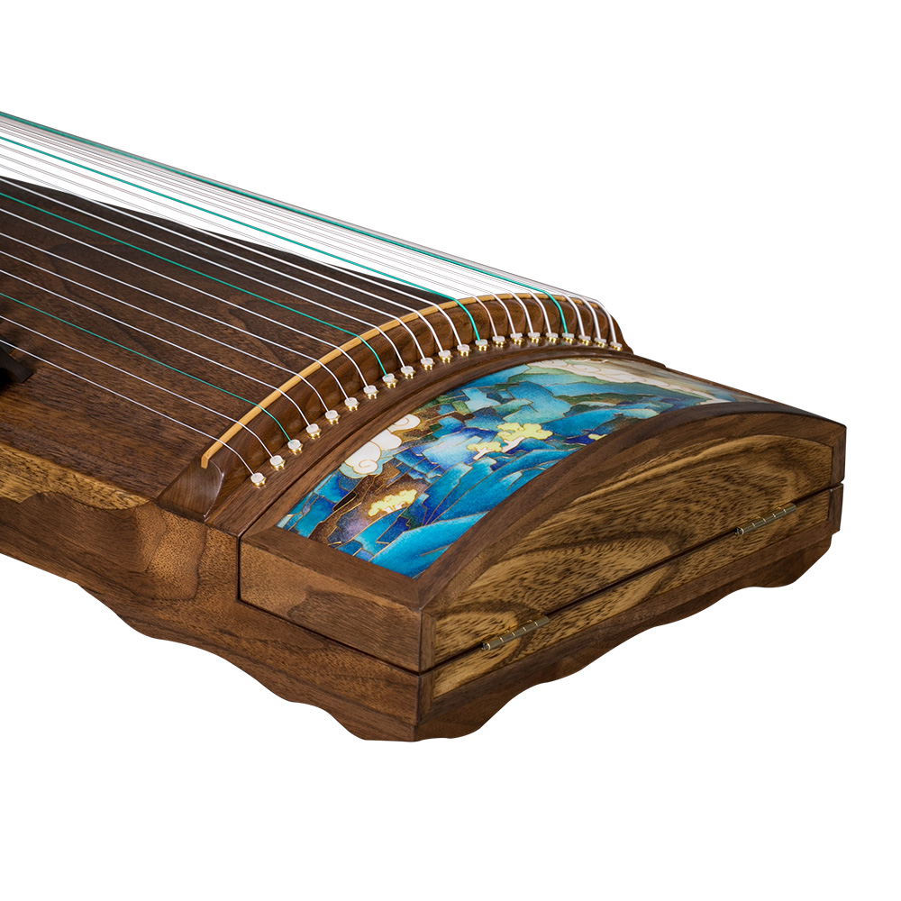 阶梯式尾岳山和内嵌式音孔镶边的设计乃行业首创。“0”油漆,环保美观的同时对工艺要求极高。采用刳制工艺,精选专业级桐木,外饰采用美国黑胡桃木,其木质色泽优雅,木纹精致。筝马由紫檀制作而成,其木质坚硬,致密,纹理纤细浮动,被视为木中极品,有“一寸紫檀一寸金”的说法。筝首筝尾画面采用国家级非物质文化遗产掐丝珐琅(Cloisonne)工艺。描绘出山峰拔地而起,峻峭玲珑,有如碧玉之簪(同”篸“)。该画面设计已获得国家著作权登记。